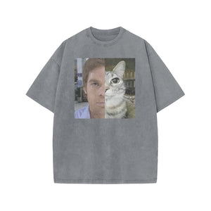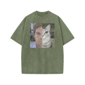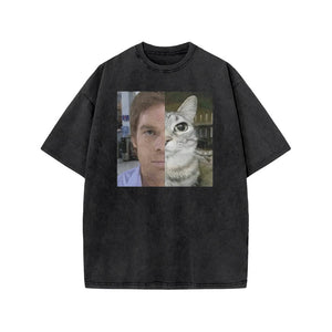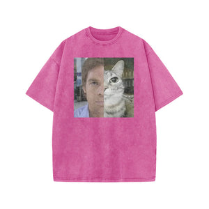 Unisex Patchwork Cat Print Acid Washed T-shirt
