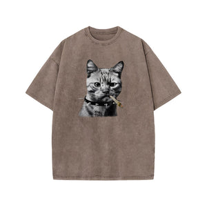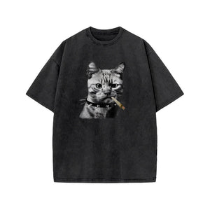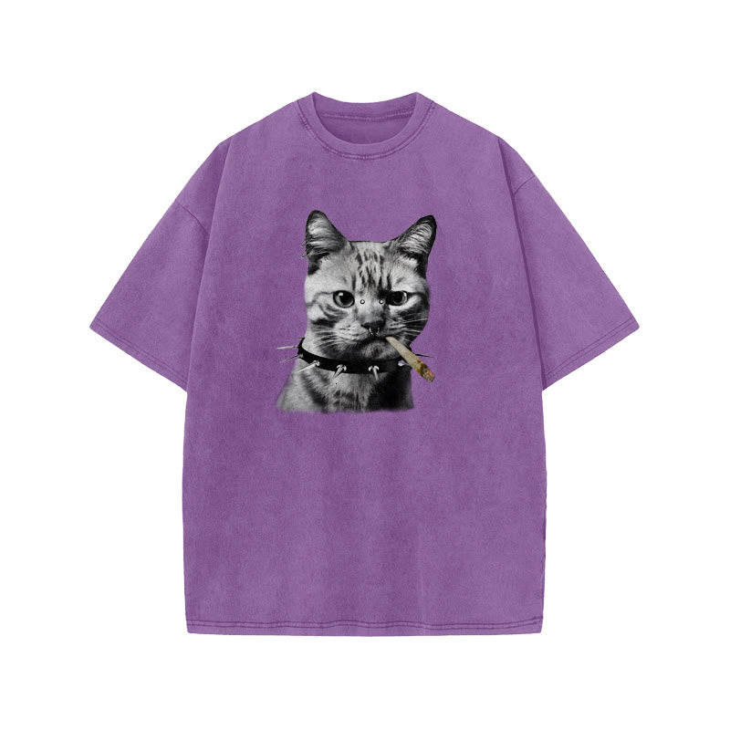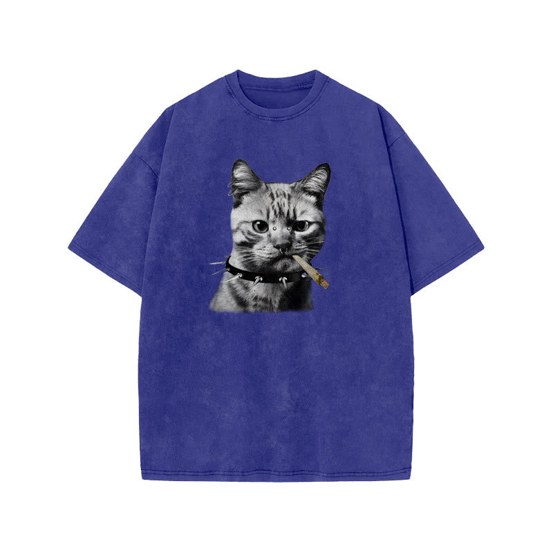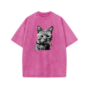 Unisex Provoking The Cat Print Acid Washed T-shirt
