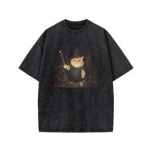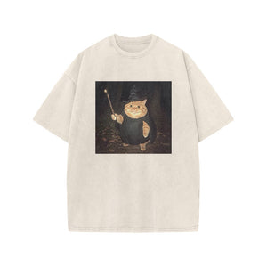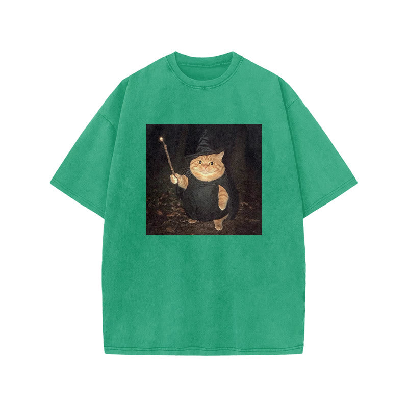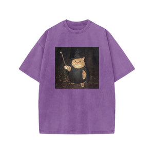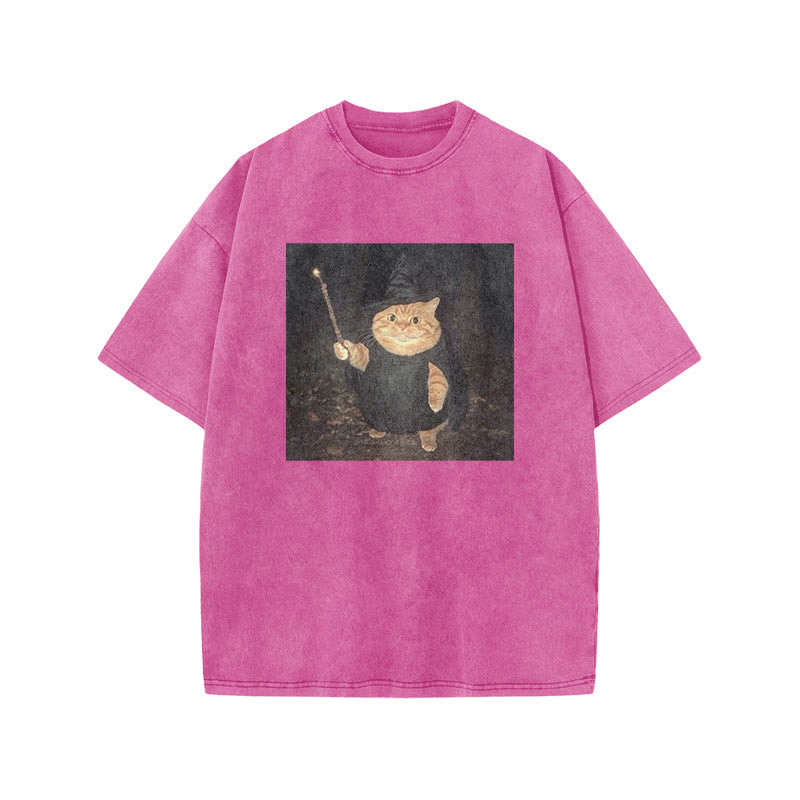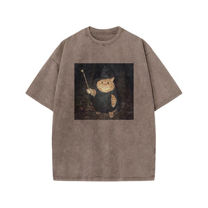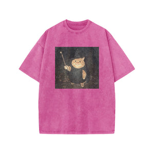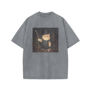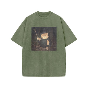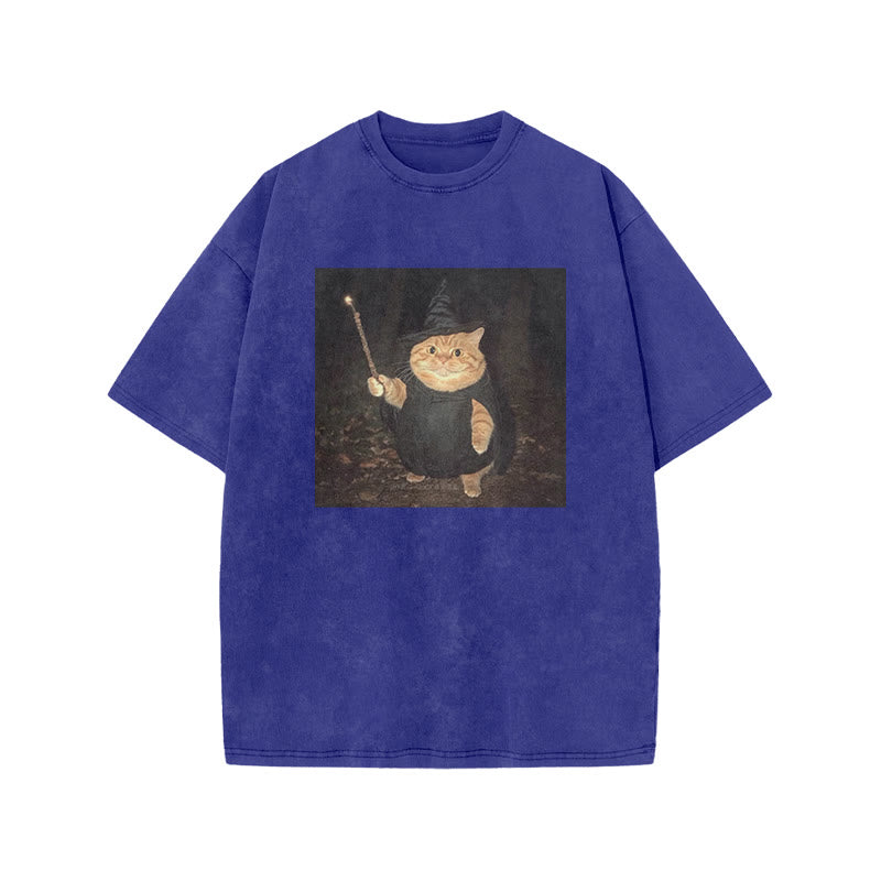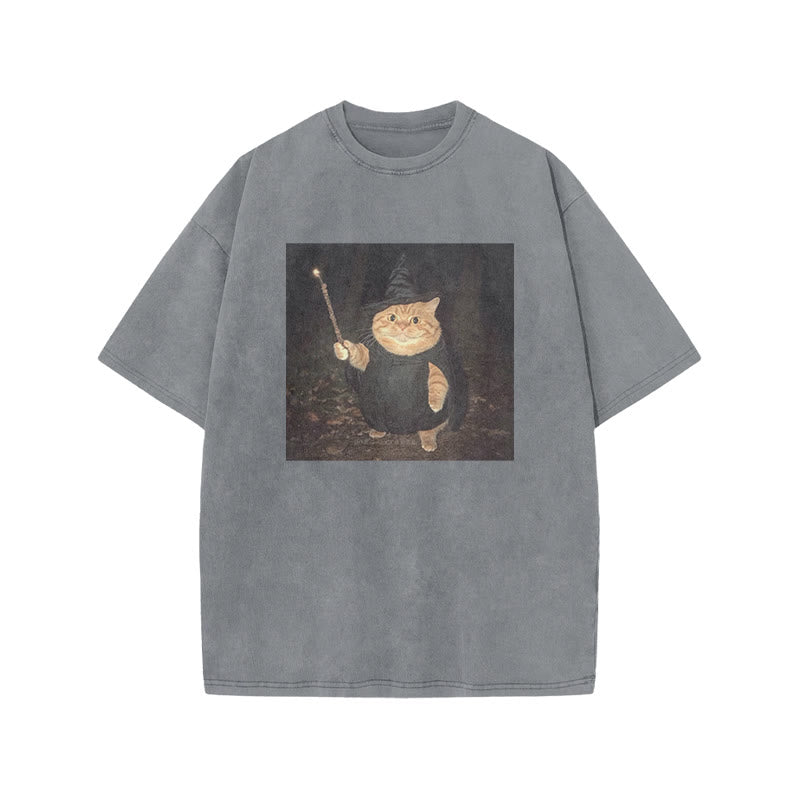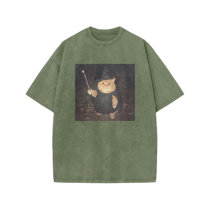 Unisex Spellcasting Wizard Cat Print Acid Washed T-shirt