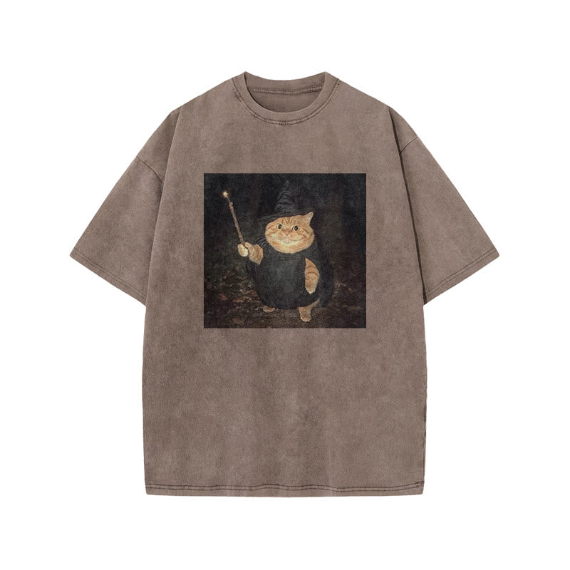 Home Unisex Spellcasting Wizard Cat Print Acid Washed T-shirt