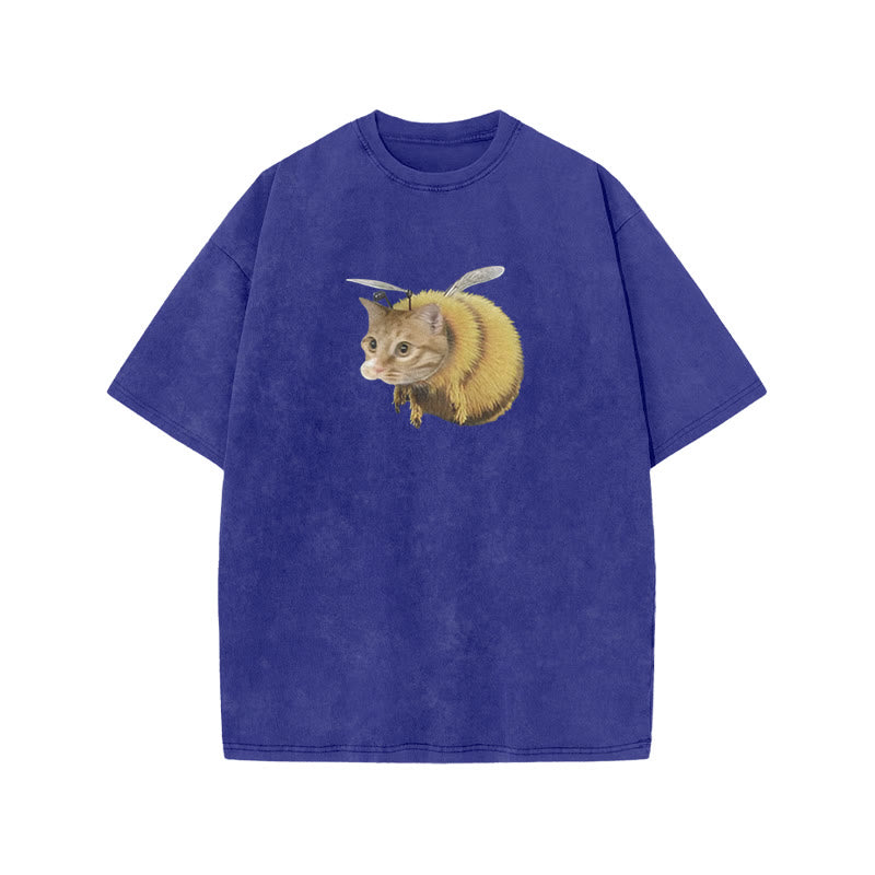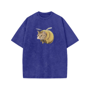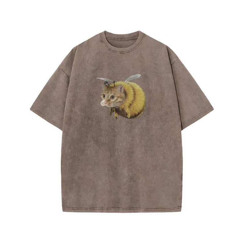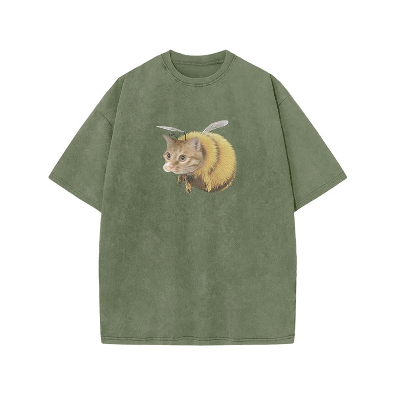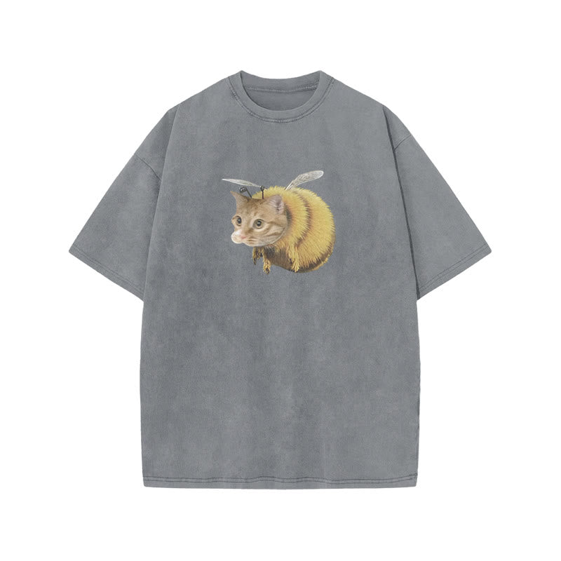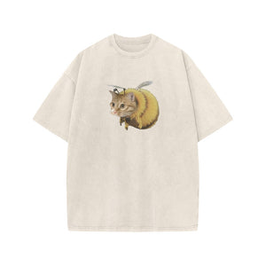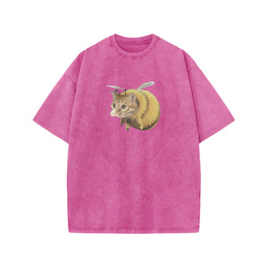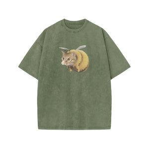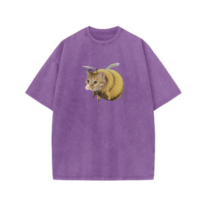 Unisex Cat Bee Print Acid Washed T-shirt