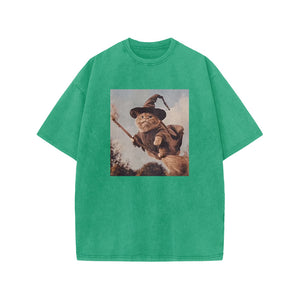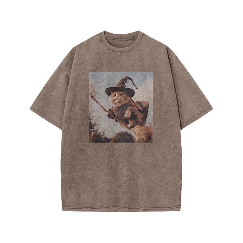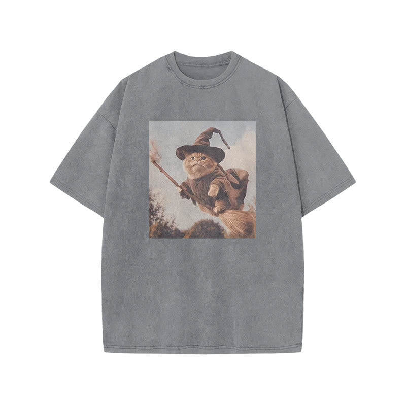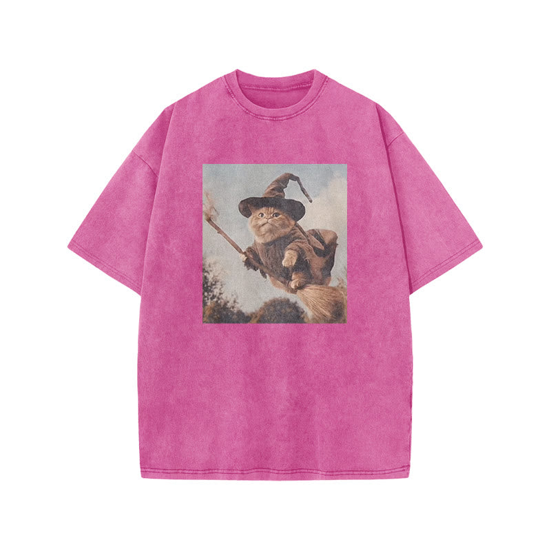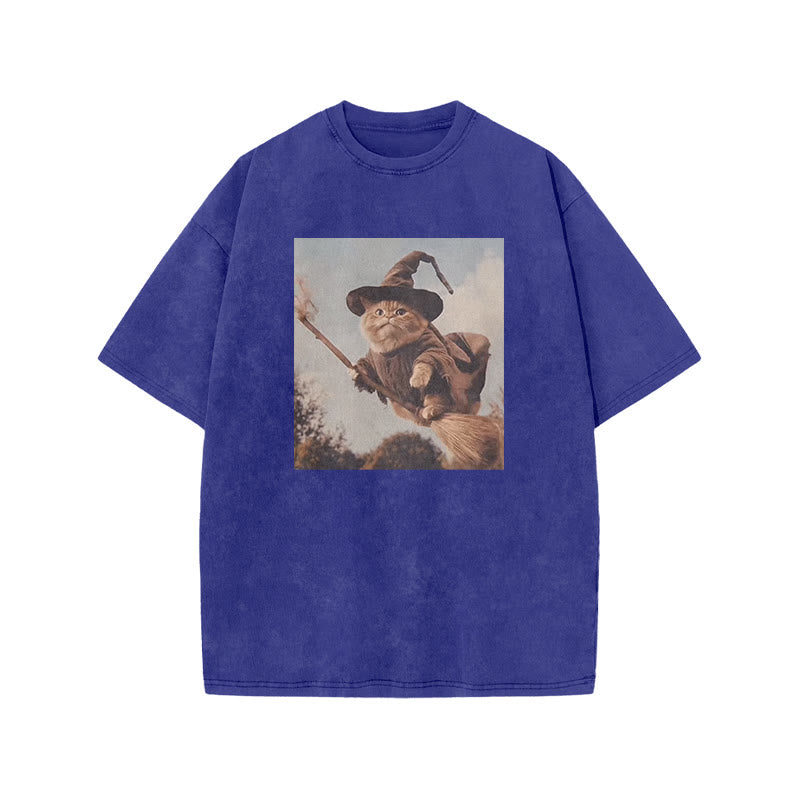 Unisex Cat Riding A Magic Broom Halloween Print Acid Washed T-shirt