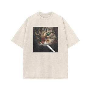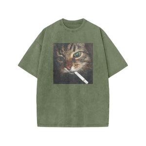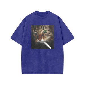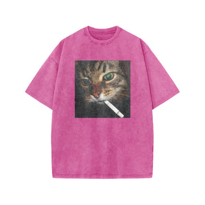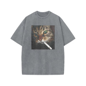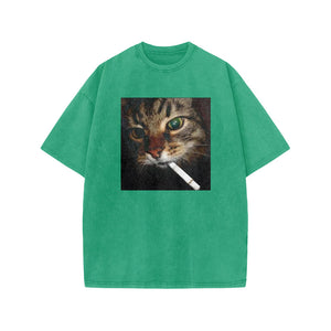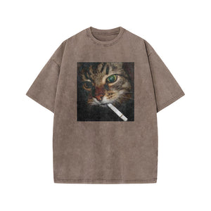 Unisex Cat With Cigarette In Mouth Print Acid Washed T-shirt