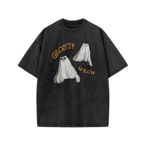 Unisex Ghost Meow Halloween Print Acid Washed T-shirt