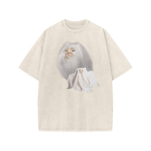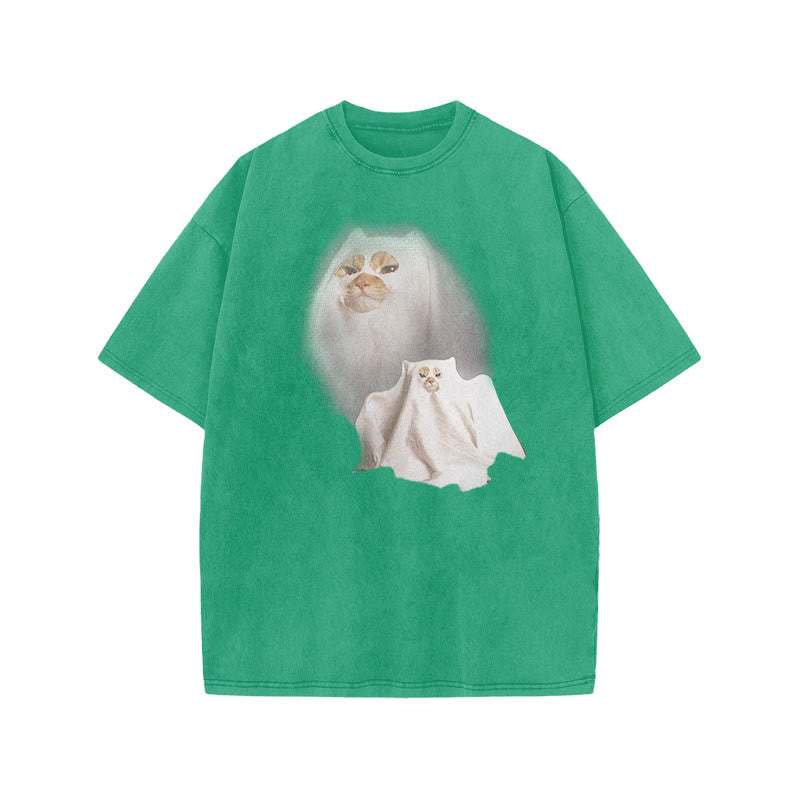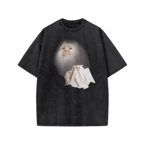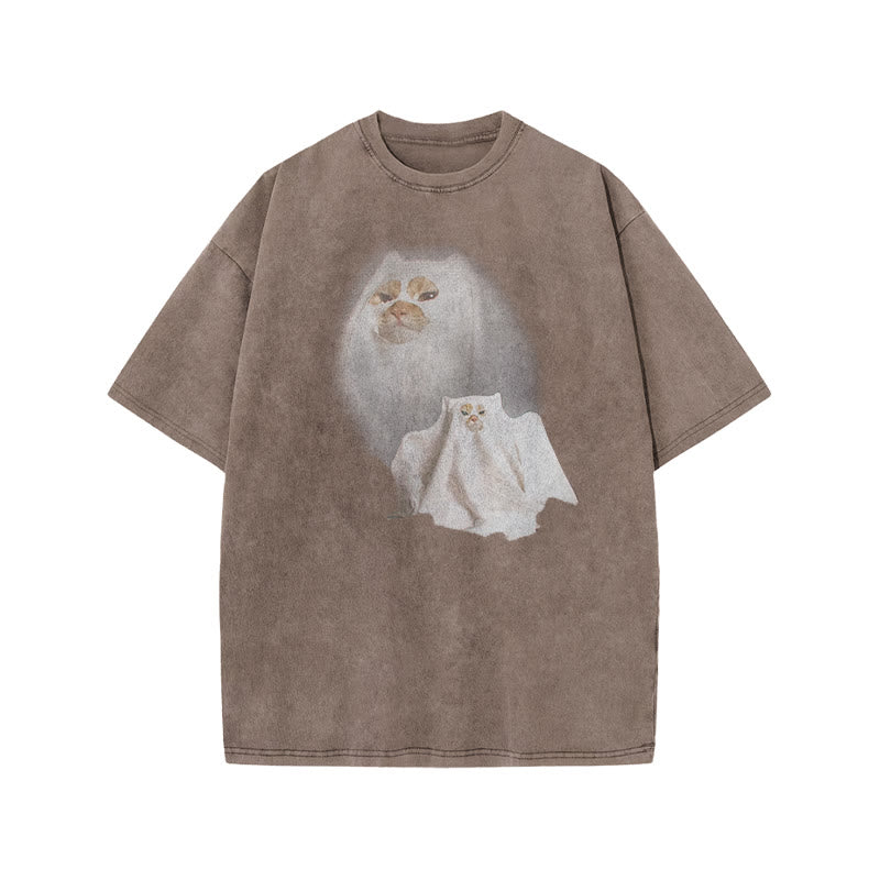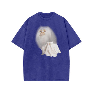 Unisex Cat Pretending To Be A Ghost Print Acid Washed T-shirt