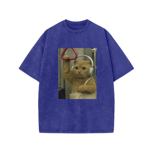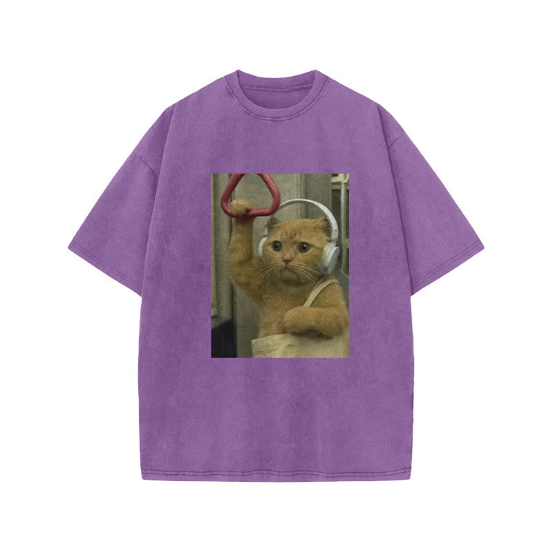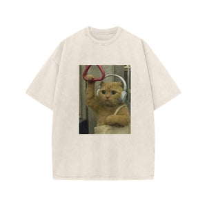Unisex Cat Riding The Subway Print Acid Washed T-shirt