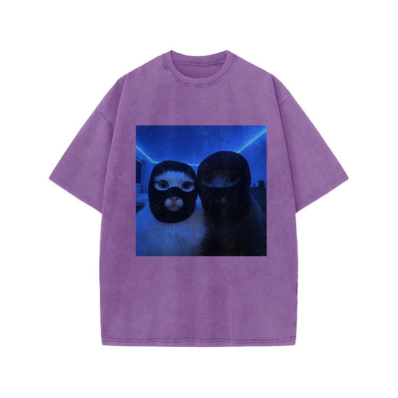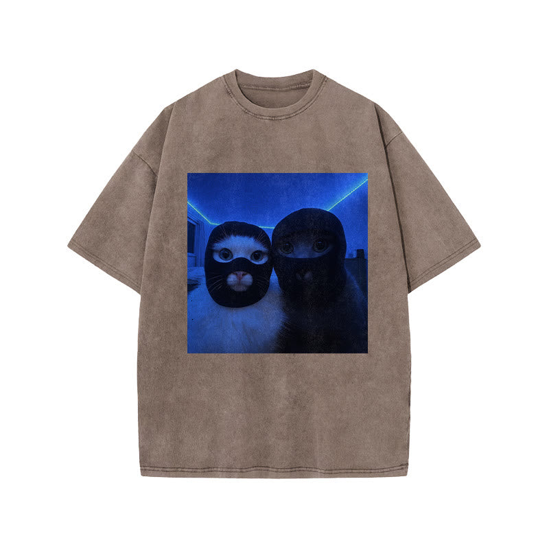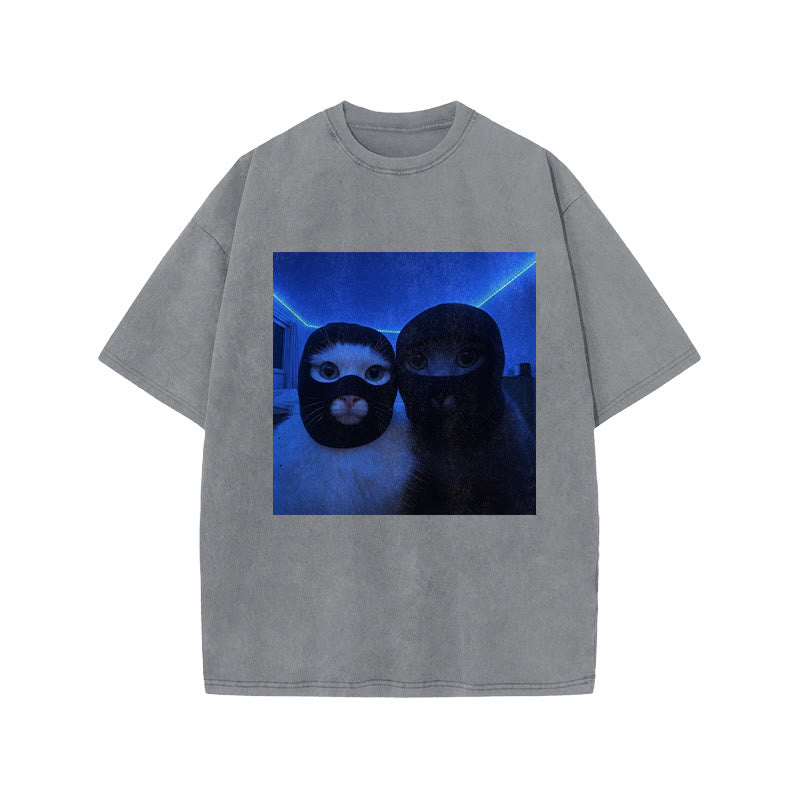 Unisex Cats Wearing Robber Mask Print Acid Washed T-shirt