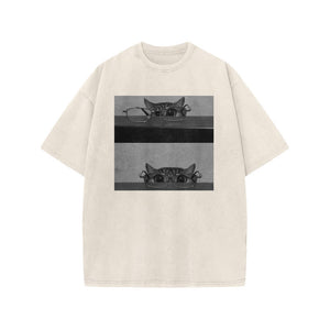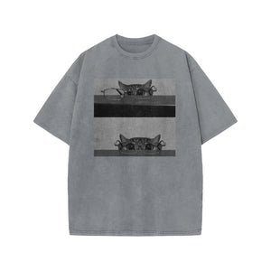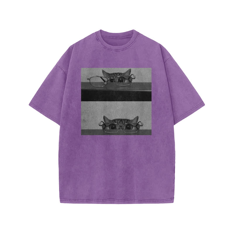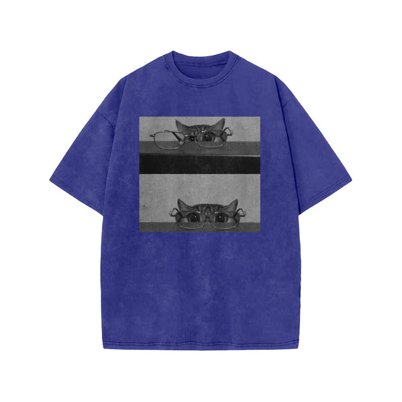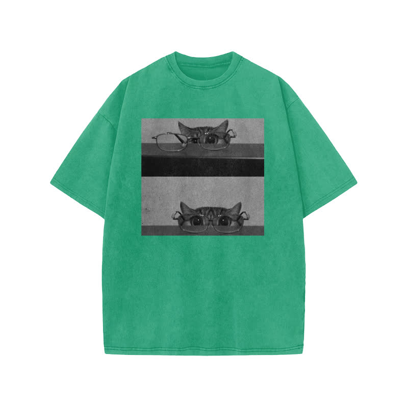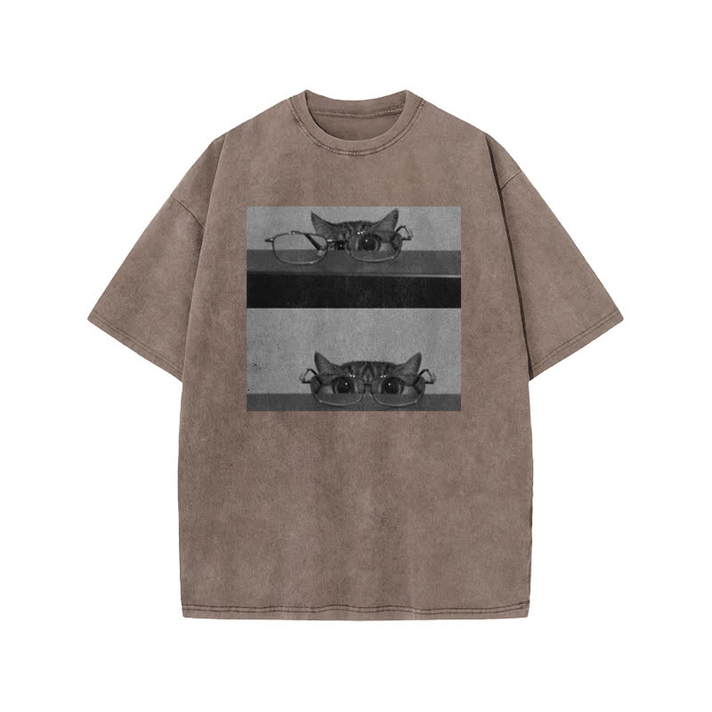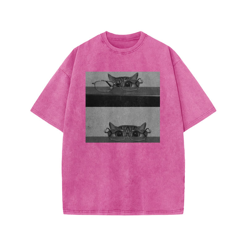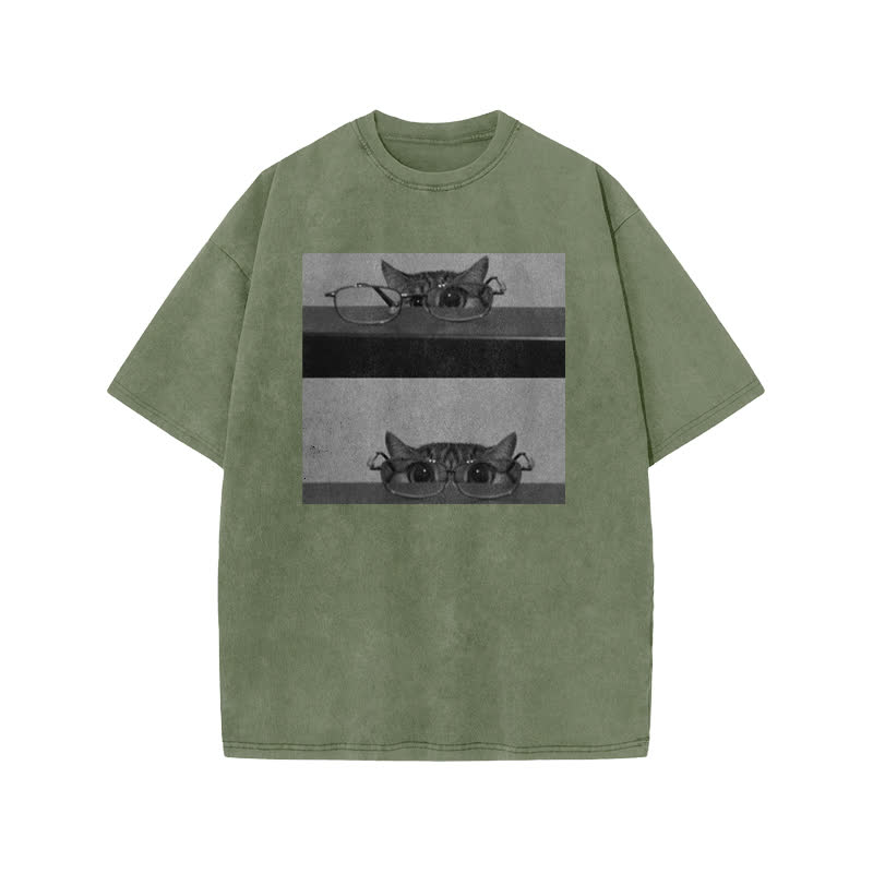 Unisex 100% Cotton Cute Cat Glasses Print Acid Washed T-shirt