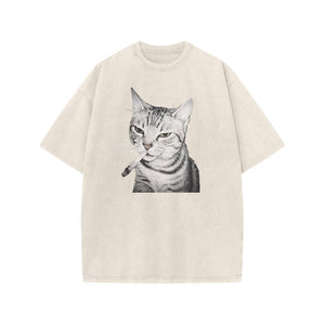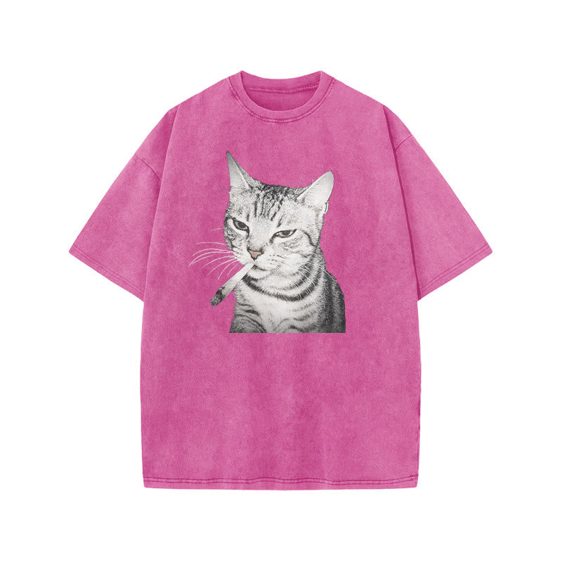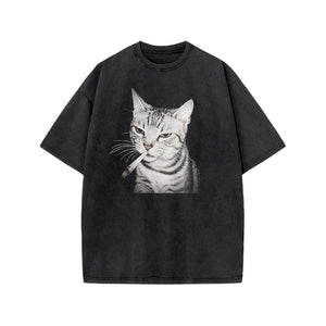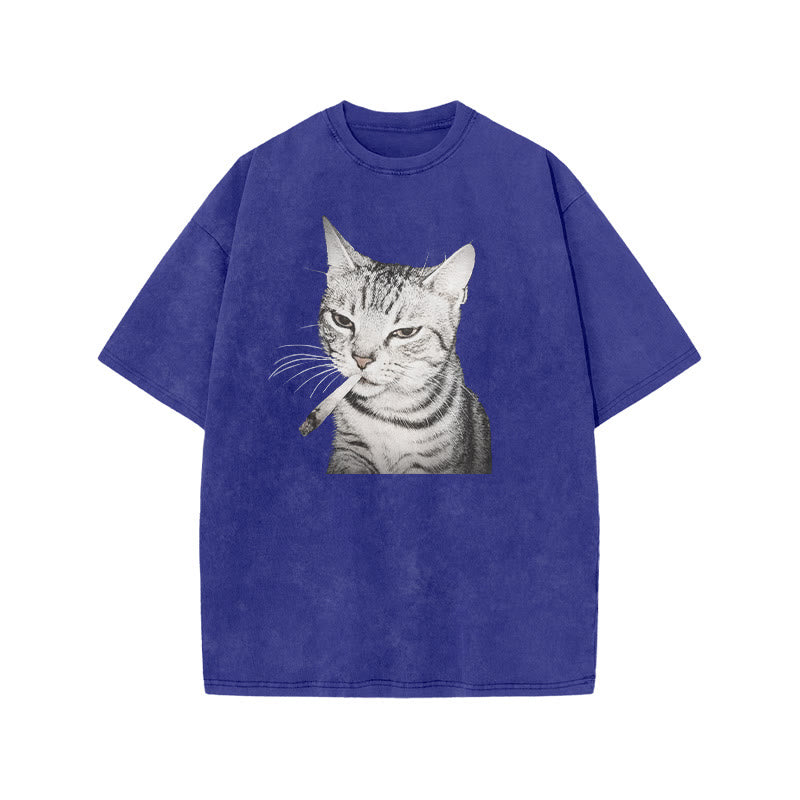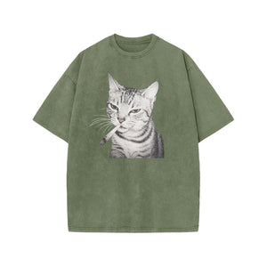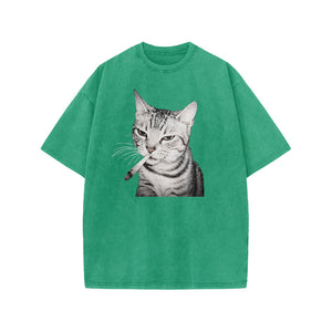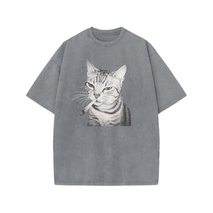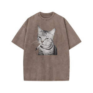 Tabby Cat With A Cigarette In Its Mouth Print Acid Washed T-shirt
