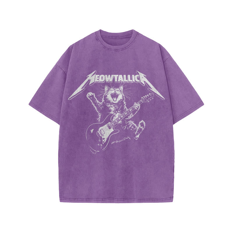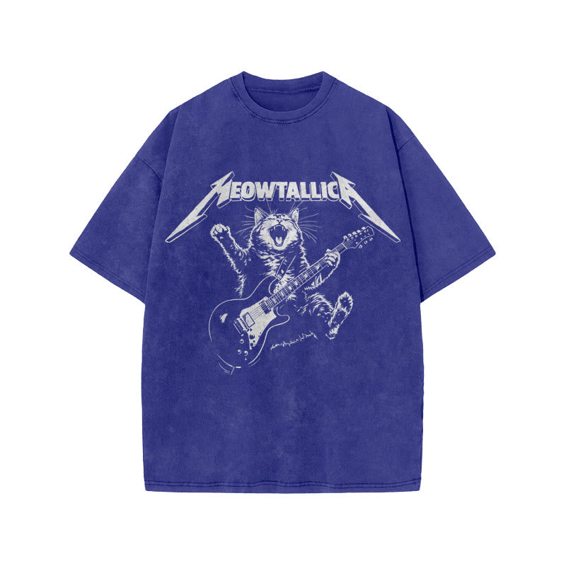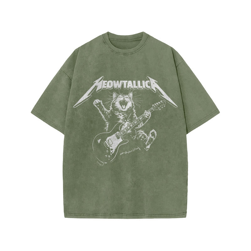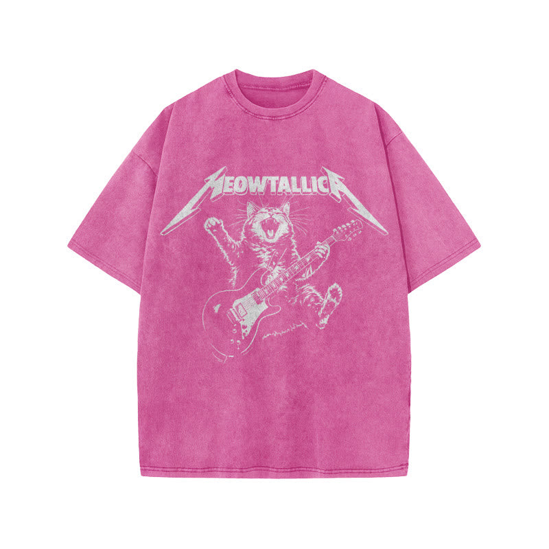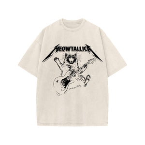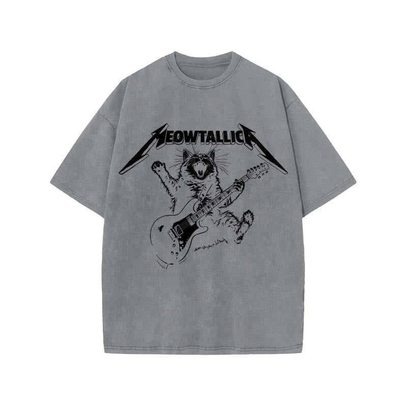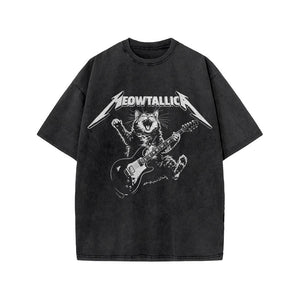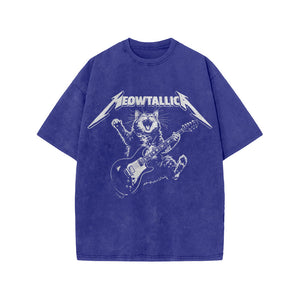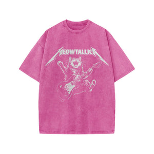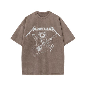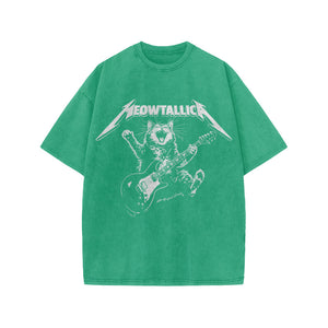 Unisex Bassist Cat Print Acid Washed T-shirt