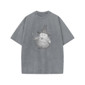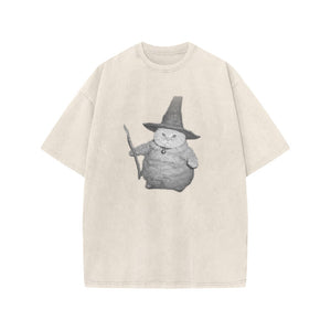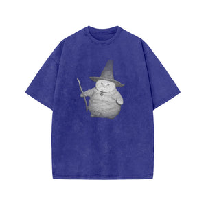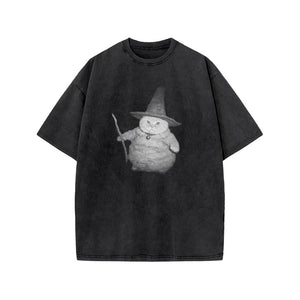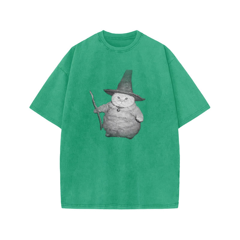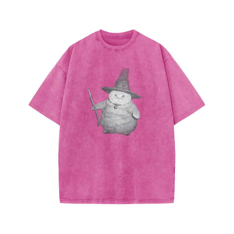 Unisex Wizard Cat Print Acid Washed T-shirt