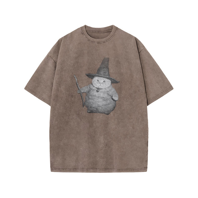 Home Unisex Wizard Cat Print Acid Washed T-shirt