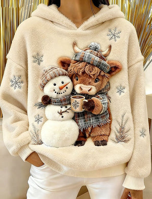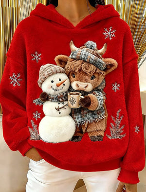 Women's Highland Cow Snowman Flannel Hooded Sweatshirt