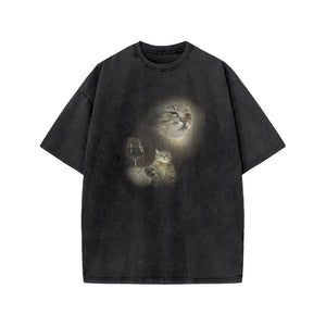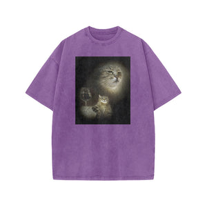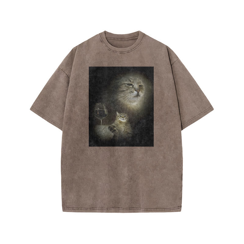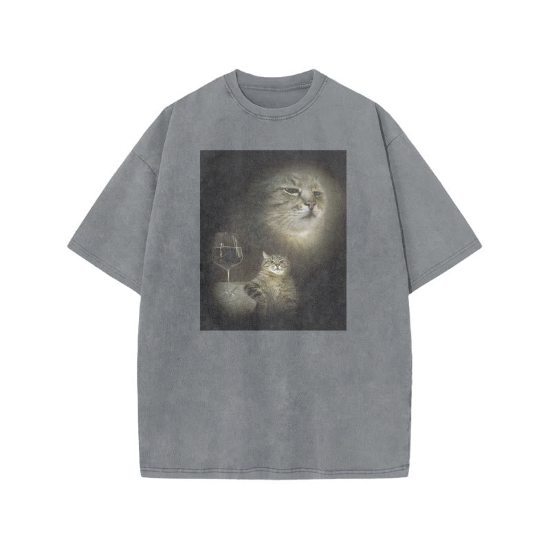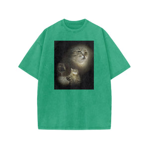 Unisex Cat And Wine Print Acid Washed T-shirt