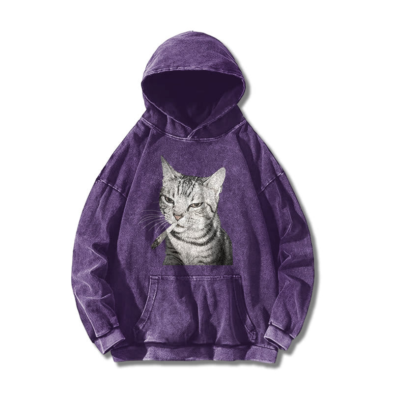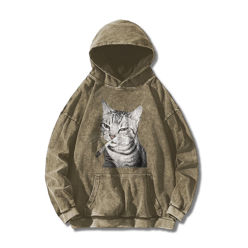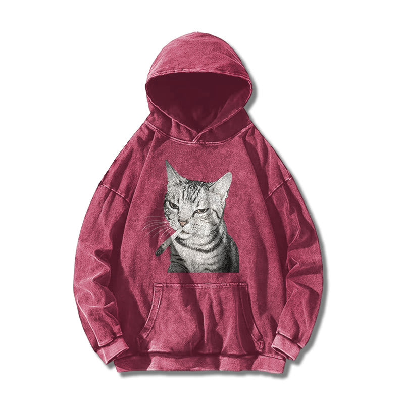 Tabby Cat With A Cigarette In Its Mouth Printed Washed Hoodie