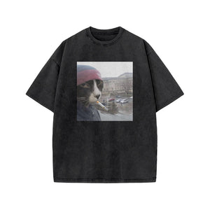Unisex Smoking Street Style Cat Print Acid Washed T-shirt